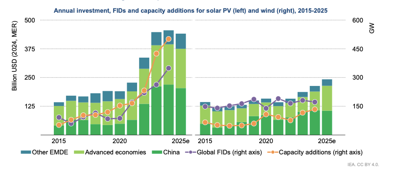 2015-2025年光伏、風(fēng)電投資及裝機(jī)規(guī)模(FID:最終投資決策) 來源:IEA