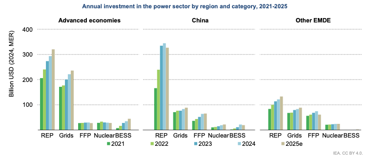 根據(jù)IEA發(fā)布的數(shù)據(jù),預(yù)計2025年,除油氣發(fā)電外,所有品類的發(fā)電投資和電網(wǎng)、儲能投資都呈現(xiàn)增長趨勢。其中發(fā)電投資約1.01萬億美元,儲能投資660億美元,電網(wǎng)投資4130億美元,電力領(lǐng)域投資增長約3%。