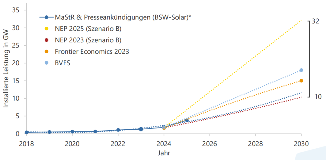 目前德國(guó)已安裝約1.9吉瓦的大型電池儲(chǔ)能系統(tǒng),到2030年這一數(shù)值可能達(dá)到兩位數(shù)。 自去年年底以來(lái),關(guān)于“電池海嘯”[1]席卷德國(guó)以及電池儲(chǔ)能市場(chǎng)出現(xiàn)“淘金熱”的新聞報(bào)道層出不窮。據(jù)稱(chēng),2025年初僅輸電系統(tǒng)運(yùn)營(yíng)商(TSO)就收到了超過(guò)220吉瓦的并網(wǎng)申請(qǐng)[2]。其背景包括鋰離子電池價(jià)格下降,以及中國(guó)電池制造商因電動(dòng)汽車(chē)銷(xiāo)量低迷而釋放出產(chǎn)能。盡管大多數(shù)新聞文章已強(qiáng)調(diào)只有部分申請(qǐng)項(xiàng)目會(huì)真正建成,但尖銳的報(bào)道引發(fā)了電網(wǎng)運(yùn)營(yíng)商、市政當(dāng)局以及如今也包括市民的擔(dān)憂。