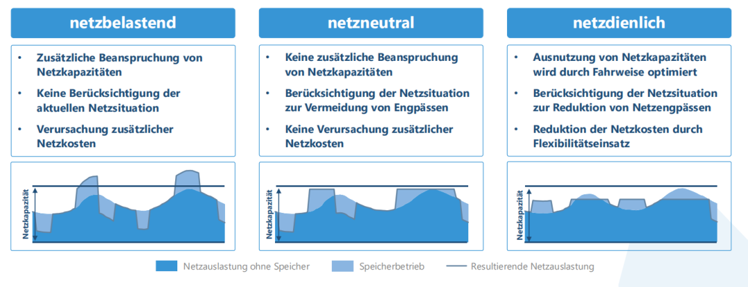 對(duì)于并網(wǎng)的、私人融資的儲(chǔ)能系統(tǒng),市場(chǎng)支持型和系統(tǒng)支持型的運(yùn)行模式——即長(zhǎng)期和非常短期的供需時(shí)間平衡——目前構(gòu)成了其大部分收入來(lái)源。然而,這兩者都屬于“銅板層面”(auf der Kupferplatte)的應(yīng)用案例,因?yàn)闊o(wú)論是調(diào)頻服務(wù)還是電力交易所交易都不具有區(qū)域性成分,無(wú)法考慮電網(wǎng)的當(dāng)?shù)貭顩r。然而,根據(jù)當(dāng)前的電網(wǎng)狀況和位置,這些運(yùn)行模式可能對(duì)電網(wǎng)產(chǎn)生不同的影響。與此相對(duì),存在一些明確基于當(dāng)前電網(wǎng)狀況的運(yùn)行模式。為區(qū)分對(duì)電網(wǎng)的影響,下文將界定“電網(wǎng)負(fù)荷型”(netzbelastend)、“電網(wǎng)中性型”(netzneutral)和“電網(wǎng)支持型”(netzdienlich)等概念(見(jiàn)圖3)[16]。