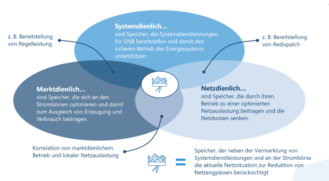 重要的是,這些定義并不與電網(wǎng)運(yùn)營(yíng)商的具體工具綁定,而是可以通過(guò)不同的方法實(shí)現(xiàn)電網(wǎng)中性和電網(wǎng)支持型。這些定義本身并非對(duì)儲(chǔ)能系統(tǒng)的普遍要求。因此,工具的設(shè)計(jì)或使用也不應(yīng)一概而論,而應(yīng)始終以當(dāng)?shù)仉娋W(wǎng)狀況(即局部和臨時(shí)的網(wǎng)絡(luò)限制)為導(dǎo)向。