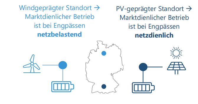 如果儲(chǔ)能系統(tǒng)的運(yùn)行模式不基于實(shí)際的電網(wǎng)負(fù)載情況,則必須假設(shè)該儲(chǔ)能系統(tǒng)在某些情況下會(huì)占用額外的電網(wǎng)容量。因此,連接此類(lèi)儲(chǔ)能系統(tǒng)通常會(huì)導(dǎo)致公共電網(wǎng)擴(kuò)建的成本(投資性標(biāo)準(zhǔn)),為此需支付建設(shè)成本分?jǐn)傎M(fèi)(BKZ)。同樣,電網(wǎng)負(fù)荷型儲(chǔ)能系統(tǒng)的運(yùn)行方式可能導(dǎo)致(額外的)電網(wǎng)運(yùn)營(yíng)商干預(yù),例如依據(jù)再調(diào)度(Redispatch)或《能源經(jīng)濟(jì)法》(EnWG)第14a條(操作性標(biāo)準(zhǔn))。一個(gè)例子就是在周邊可再生能源(EE)發(fā)電設(shè)施被限電的同時(shí),從儲(chǔ)能系統(tǒng)向電網(wǎng)注入電力。
