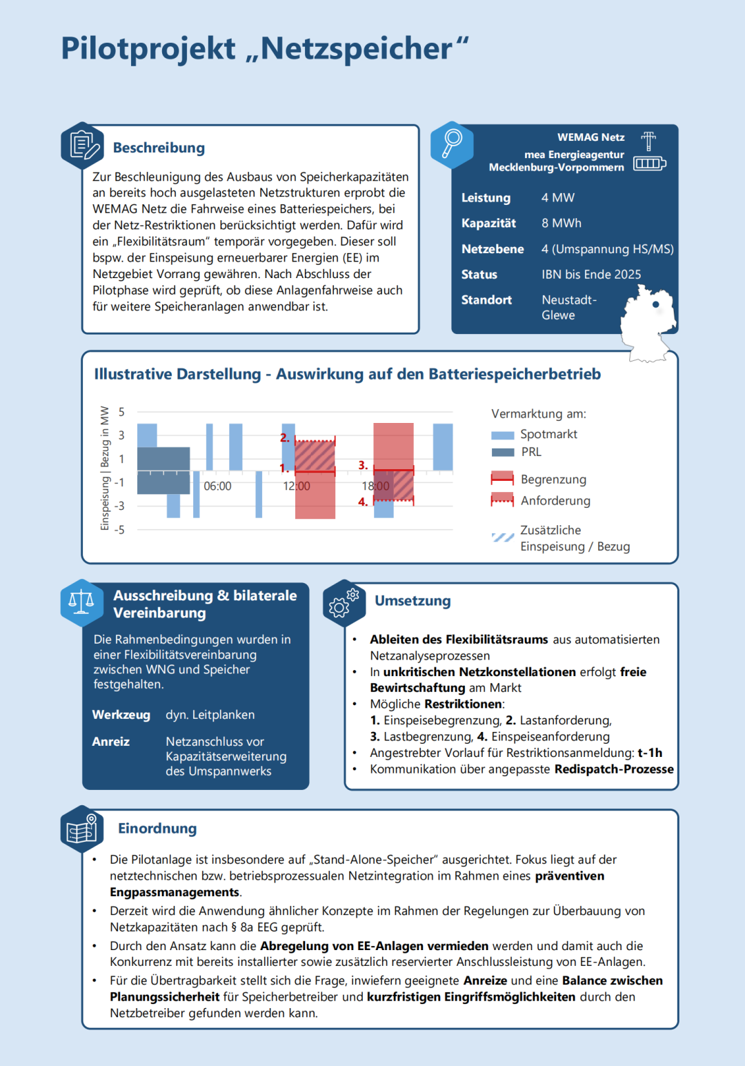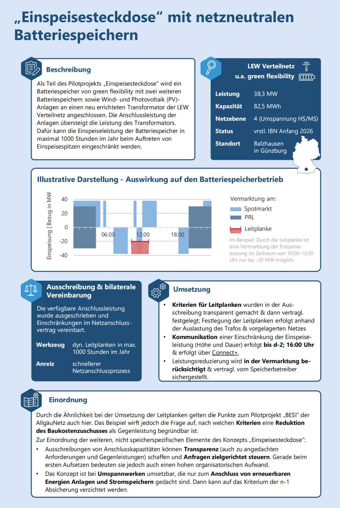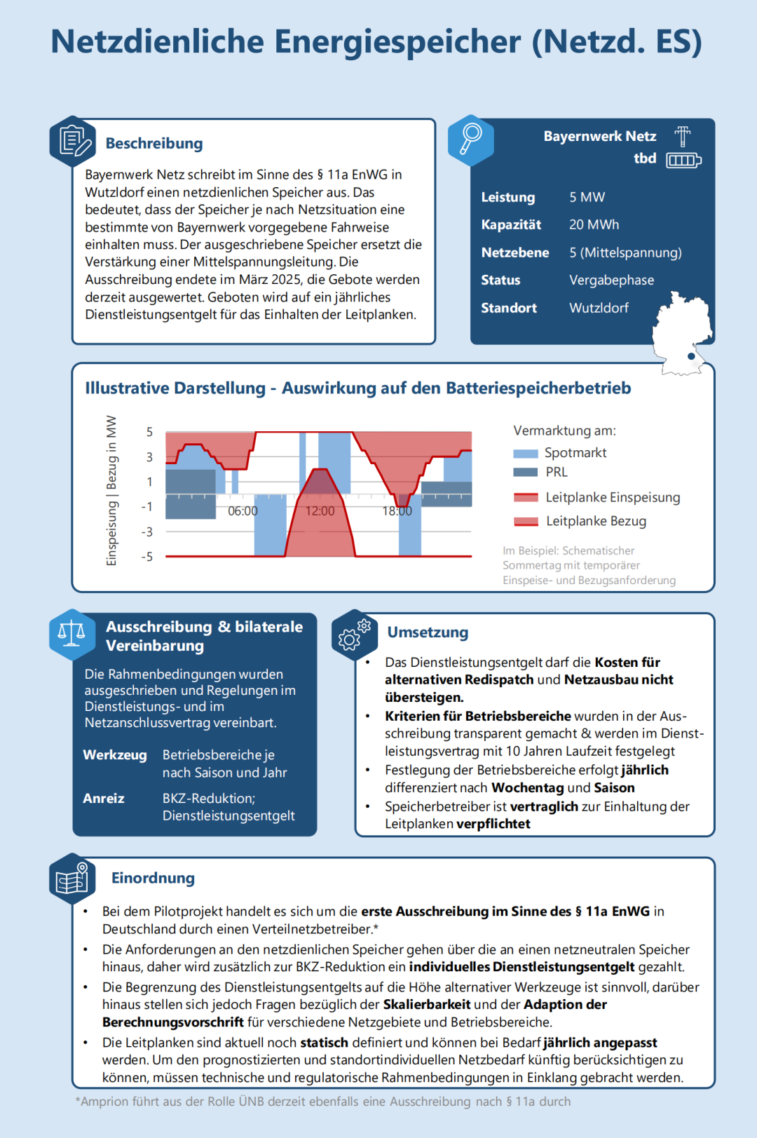 Bayernwerk Netz 依據(jù)《能源經(jīng)濟(jì)法》(EnWG)第11a條在武茨爾多夫(Wutzldorf)招標(biāo)一個(gè)電網(wǎng)支持型儲(chǔ)能系統(tǒng)。這意味著儲(chǔ)能系統(tǒng)必須根據(jù)電網(wǎng)狀況遵守Bayernwerk規(guī)定的特定運(yùn)行方式。招標(biāo)的儲(chǔ)能系統(tǒng)替代了一條中壓線路的升級(jí)。招標(biāo)于2025年3月結(jié)束,目前正在評(píng)估投標(biāo)。投標(biāo)針對(duì)的是遵守運(yùn)行邊界的年度服務(wù)費(fèi)。