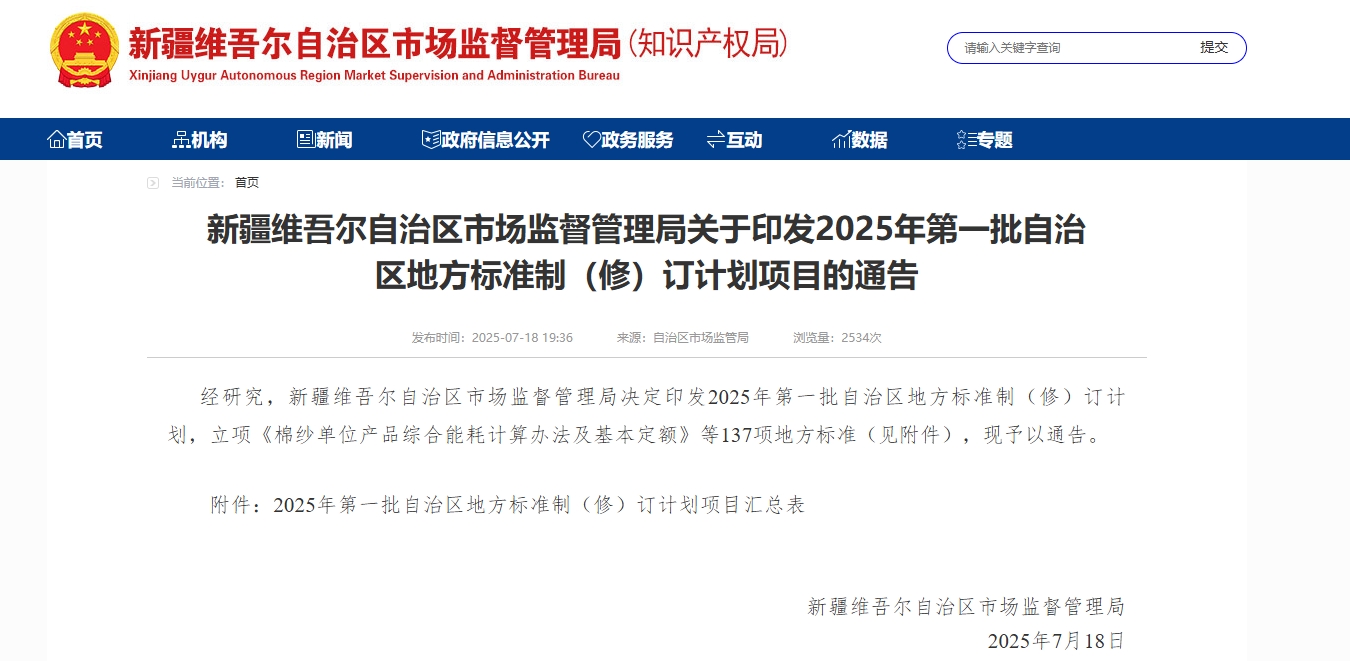 經(jīng)研究,新疆維吾爾自治區(qū)市場監(jiān)督管理局決定印發(fā)2025年第一批自治區(qū)地方標準制(修)訂計劃,立項《棉紗單位產(chǎn)品綜合能耗計算辦法及基本定額》等137項地方標準(見附件),現(xiàn)予以通告。