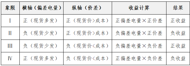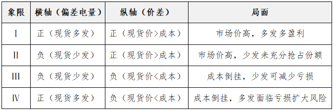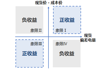 橫軸是現(xiàn)貨偏差電量,即現(xiàn)貨中標量減去中長期電量;零點(原點)右側(cè)表示現(xiàn)貨中標量 > 中長期合約電量(正偏差,即現(xiàn)貨多發(fā));零點左側(cè)表示現(xiàn)貨中標量 < 中長期合約電量(負偏差,即現(xiàn)貨少發(fā))??v軸是現(xiàn)貨價與成本價之差;零點上側(cè)表示現(xiàn)貨價 > 發(fā)電成本;零點下側(cè)表示現(xiàn)貨價 < 發(fā)電成本。