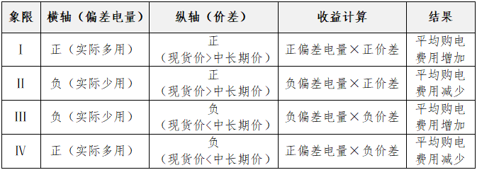 橫軸是現(xiàn)貨偏差電量,也即現(xiàn)貨中標量減去中長期電量;零點右側(cè)表示現(xiàn)貨中標量 > 中長期合約電量(正偏差,即實際多用);零點左側(cè)表示現(xiàn)貨中標量 < 中長期合約電量(負偏差,即實際少用)??v軸是現(xiàn)貨價格與中長期合約價格之差;零點上側(cè)表示現(xiàn)貨價 > 中長期價;零點下側(cè)表示現(xiàn)貨價 < 中長期價。