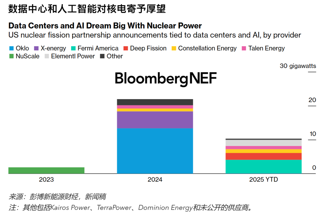 自2023年初以來,美國大型科技公司和數(shù)據(jù)中心提供商已宣布與18家核裂變電力供應商建立合作伙伴關系。彭博新能源財經(jīng)匯編的數(shù)據(jù)顯示,這些合作項目總計擁有32GW的龐大裝機儲備。但這些項目何時以及將有多少規(guī)模投入使用仍有待觀察,因為技術、許可和成本方面存在諸多挑戰(zhàn)。