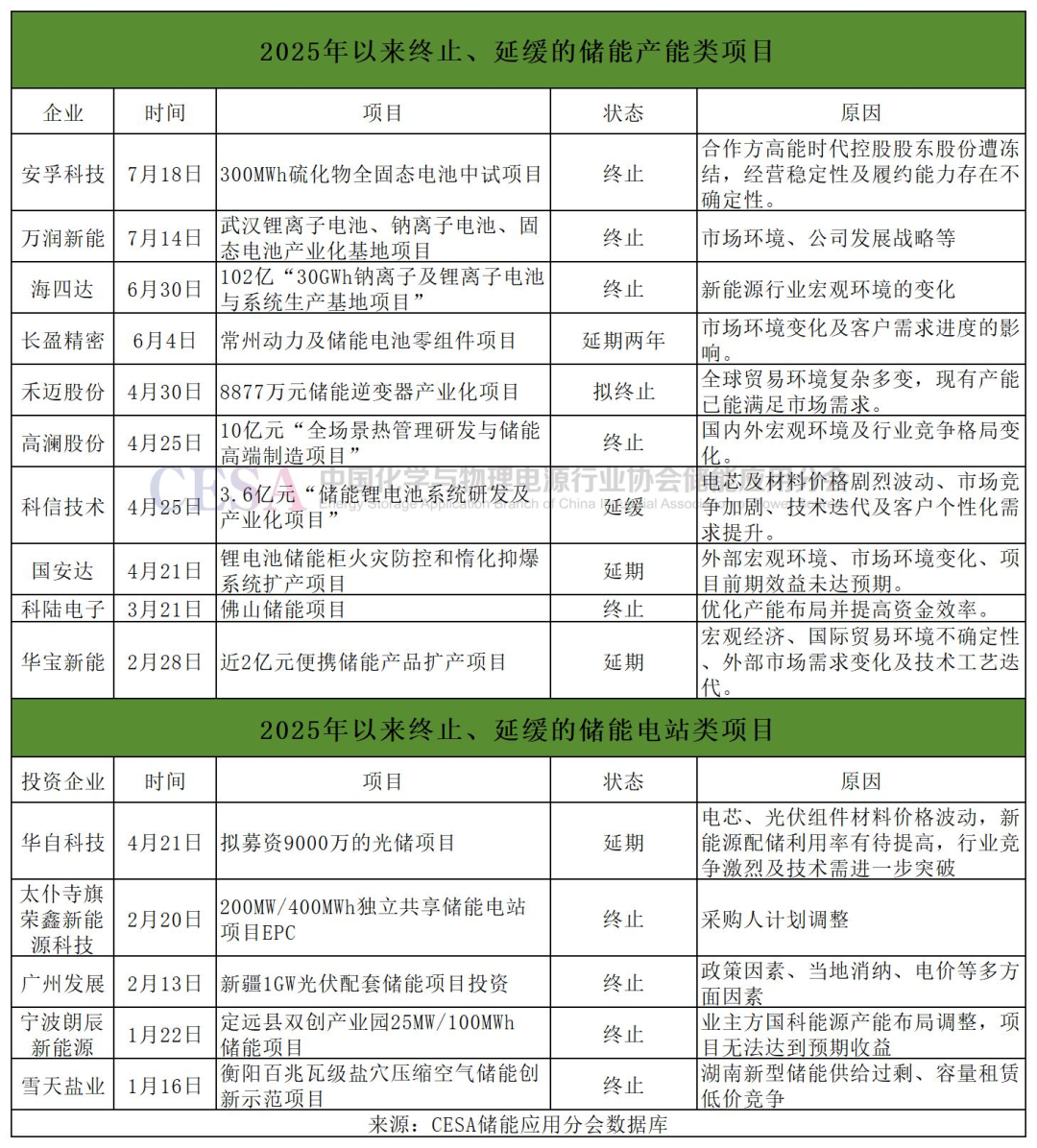 中國儲能網(wǎng)訊:據(jù)CESA儲能應(yīng)用分會數(shù)據(jù)庫不完全統(tǒng)計,2025年以來,已有至少15個儲能產(chǎn)能類、電站類項目相繼終止、延期,儲能產(chǎn)能類涉及的技術(shù)類型包括鋰離子電池、鈉離子電池、固態(tài)電池、儲能逆變器、系統(tǒng)集成等項目,電站類涉及獨立儲能、光儲、壓縮空氣等項目,涉及的投資資金超百億元。