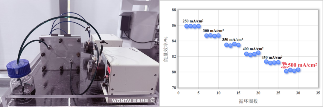 中國儲能網(wǎng)訊:近日,寰泰儲能研發(fā)團隊在關鍵核心技術領域取得重大進展。在室溫25℃,硫酸電解液體系(釩摩爾濃度:1.65-1.75 mol/L)下,成功開發(fā)了運行電流密度突破至500 mA/cm2的科研級電池單元,該電池活性面積達50 cm2,能量效率≧80%。這一指標刷新了行業(yè)已知紀錄,為液流電池高功率密度開發(fā)提供了有效解決方案。