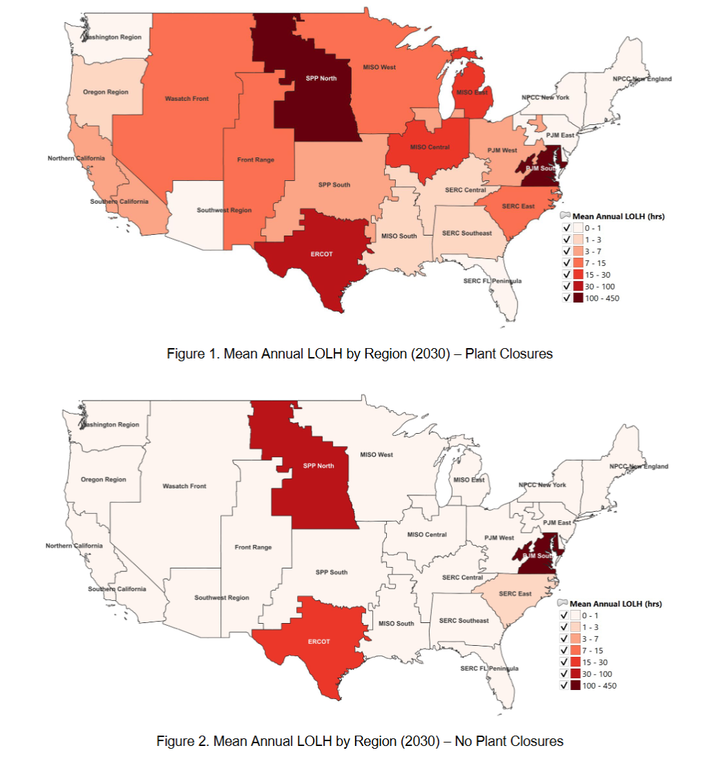 分區(qū)域看,在電廠關(guān)閉情景下,除ISO-NE、NYISO區(qū)域外,所有區(qū)域均未達(dá)到可靠性標(biāo)準(zhǔn)。即便現(xiàn)有電廠全部保留,PJM、SPP、ERCOT和SERC-East等區(qū)域在冬季仍存在結(jié)構(gòu)性風(fēng)險(xiǎn)。