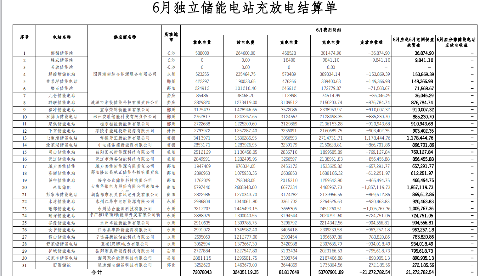 6月獨(dú)立儲(chǔ)能電站充放電結(jié)算單顯示,湖南31個(gè)獨(dú)立儲(chǔ)能電站的充放電收益為-2127.278254萬(wàn)元,8月應(yīng)退6月電網(wǎng)側(cè)盈余資金2127.278254萬(wàn)元。