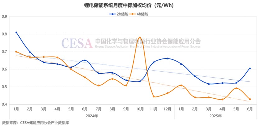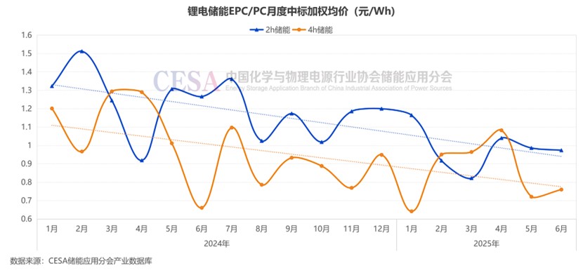 這一系列政策組合拳的出臺(tái)有著深刻行業(yè)背景。據(jù)CESA儲(chǔ)能應(yīng)用分會(huì)產(chǎn)業(yè)數(shù)據(jù)庫不完全統(tǒng)計(jì),2024年鋰電儲(chǔ)能EPC中標(biāo)均價(jià)為1.175元/Wh,同比下降16.07%。2024年鋰電儲(chǔ)能系統(tǒng)中標(biāo)均價(jià)0.574元/Wh,同比下降47.82%。2025年1—6月,鋰電儲(chǔ)能EPC/PC中標(biāo)均價(jià)0.9618元/Wh,同比下降24.09%。2025年1—6月,鋰電儲(chǔ)能系統(tǒng)中標(biāo)均價(jià)0.4848元/Wh,同比下降29.94%。