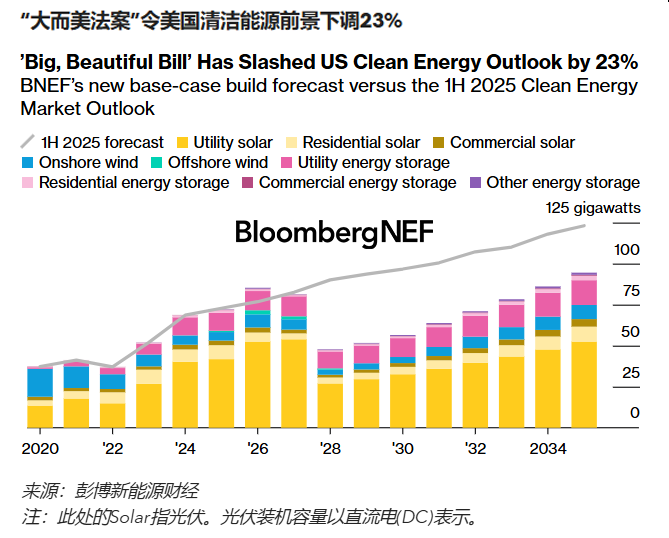 新頒布的“大而美法案”重塑了美國清潔能源格局,收緊了稅收抵免的準入門檻,并抑制了項目儲備的勢頭。風電和光伏項目獲得這些抵免仍有捷徑,但對大多數開發(fā)商而言,這條路并非易事。彭博新能源財經修訂后的展望目前預測,到2030年,風電、光伏和儲能新增裝機將較2025年上半年的基準情景下降23%。