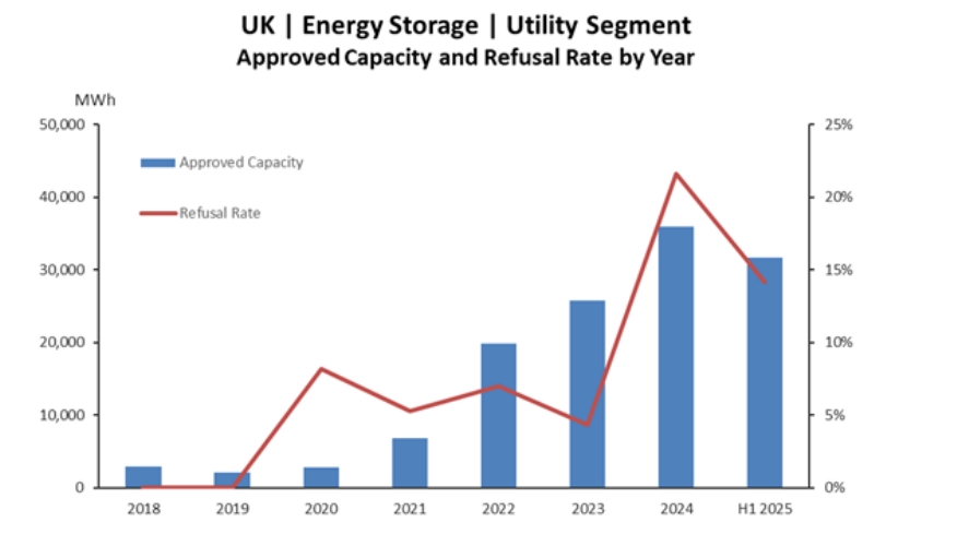 2025年上半年,英國完成部署的電池儲(chǔ)能項(xiàng)目儲(chǔ)能容量增長78%,提交規(guī)劃獲得審批的項(xiàng)目儲(chǔ)能容量增長25%,獲批的電池儲(chǔ)能項(xiàng)目儲(chǔ)能容量增長49%。