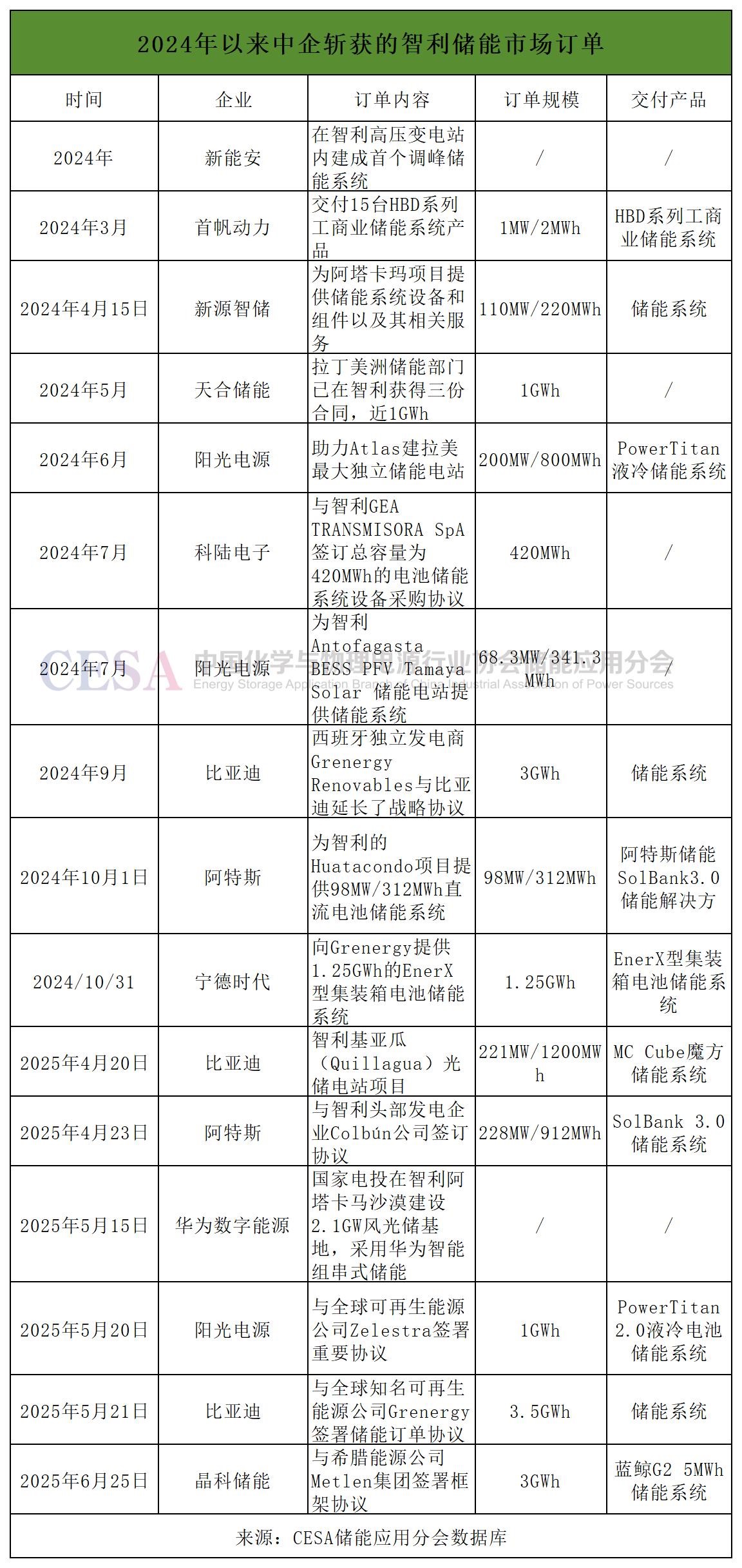 據(jù)CESA儲能應(yīng)用分會數(shù)據(jù)庫不完全統(tǒng)計(jì),2024年以來,包括寧德時代、比亞迪、天合儲能、華為、科陸電子、阿特斯等11家企業(yè)共在智利市場拿下16.96GWh儲能訂單,僅2025年上半年,中國在智利儲能市場就拿下了9.6GWh訂單,是美國市場的2.5倍。