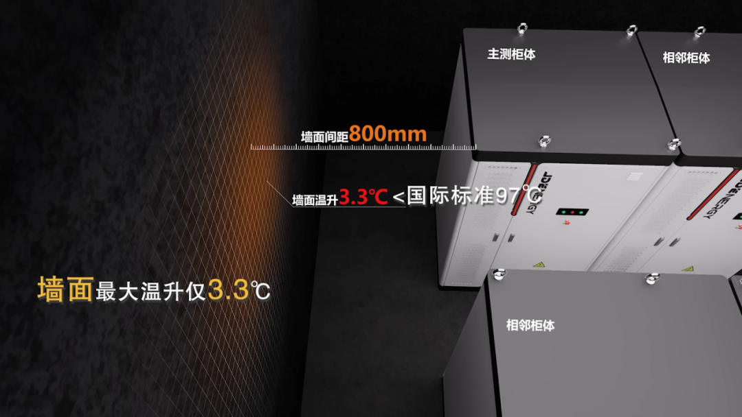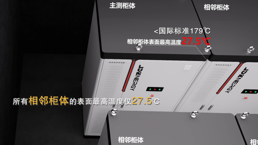 經(jīng)過48小時測試,主柜未起火、未爆炸,內(nèi)部主體結(jié)構(gòu)完好,無解體坍塌,外觀無明顯損傷;所有相鄰柜體的表面最高溫度僅27.5℃(遠低于國際標準179℃),且外觀及內(nèi)部均完好如初,電池數(shù)據(jù)及BMS功能正常;墻面最大溫升僅3.3℃(遠低于國際標準97℃)。