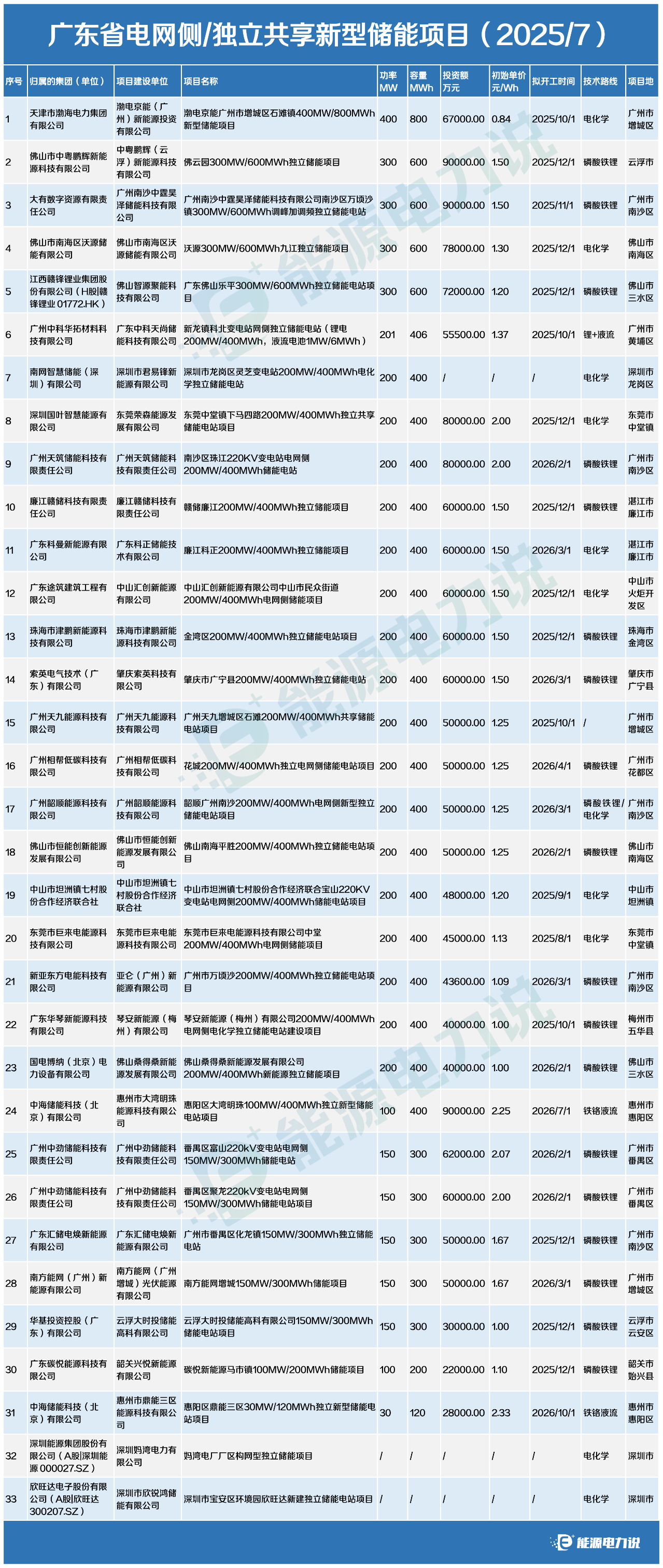 項目投資主體方面,33個項目,涉及項目建設單位32家,按歸屬的集團(單位)統(tǒng)計,涉及主要投資方31家。包括北京中海儲能科技、廣州中勁儲能科技、贛鋒鋰業(yè)、深圳能源集團、欣旺達、新亞東方電能科技、華基投資控股、東莞巨來電能源科技、南網(wǎng)智慧儲能、深圳國葉智慧能源等。