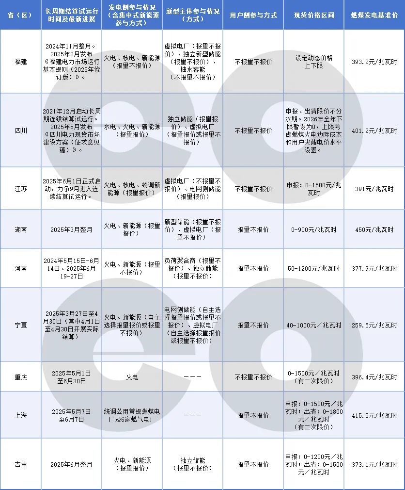 福建、四川、江蘇、湖南、河南、寧夏、重慶、上海、吉林等地已開展過整月及以上長(zhǎng)周期結(jié)算試運(yùn)行。eo據(jù)公開資料梳理上述地區(qū)最新進(jìn)展如下表: