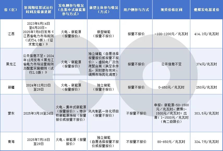 江西、黑龍江、新疆、蒙東、青海等地已開展過短周期結(jié)算試運(yùn)行。eo據(jù)公開資料梳理上述地區(qū)最新進(jìn)展如下表:
