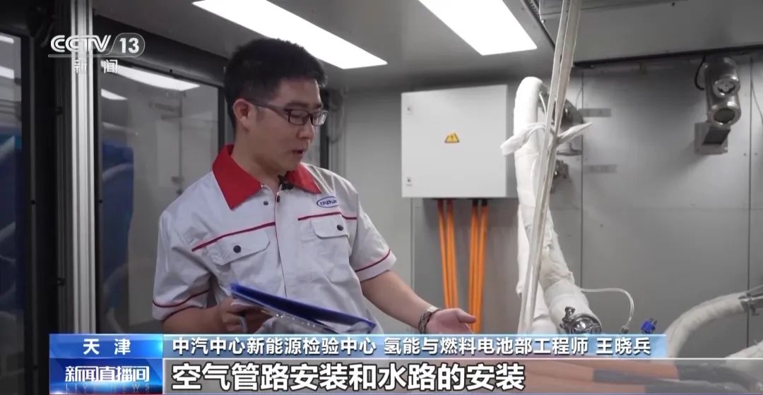 中汽中心新能源檢驗中心氫能與燃料電池部工程師 王曉兵:在測試之前我們基本都會對樣品進行燃料電池的氣密性的檢測,保證氫氣不會泄漏,包括整個氫氣管路的安裝、空氣管路安裝和水路的安裝,以及電子負載的負載線安裝,必須確保每一個連接步驟的安全性。