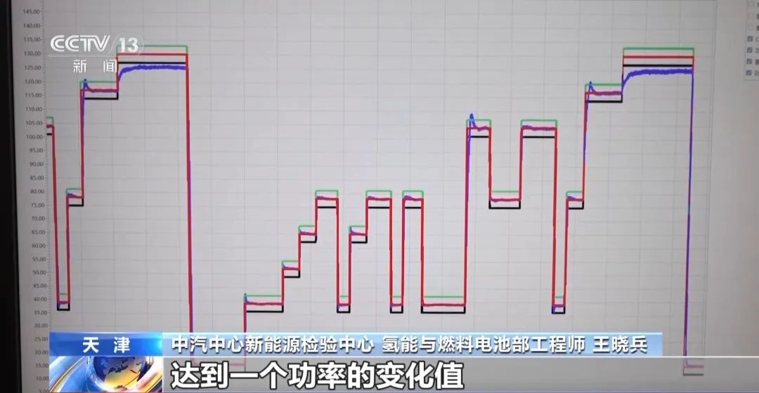 中汽中心新能源檢驗中心氫能與燃料電池部工程師 王曉兵:這個線就是基于我們實際道路模擬司機的行為,開始啟停、高速、怠速,然后轉(zhuǎn)化出來的針對這個系統(tǒng)的工況。紅色的是實際要求達到一個功率的變化值,藍色的就是實際發(fā)出來的自己的表現(xiàn)。