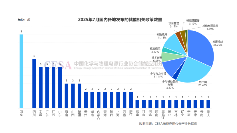 從區(qū)域來看,7月份共有29個省/自治區(qū)/直轄市發(fā)布了儲能相關(guān)政策。其中四川6項,安徽、廣東、江蘇、山東各有5項,海南、山西、新疆各有3項。貴州、湖南、內(nèi)蒙古、青海、陜西、上海、西藏、浙江等省份也發(fā)布了多項政策。