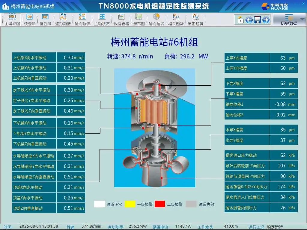 在6號(hào)機(jī)組安裝過(guò)程中,梅州抽水蓄能電站二期項(xiàng)目部組織各參建單位嚴(yán)格把控安裝質(zhì)量及精度,盤車數(shù)據(jù)優(yōu)異,發(fā)電工況帶負(fù)載運(yùn)行各軸承擺度均在5道(50微米)左右。6號(hào)機(jī)組于2025年7月19日正式開(kāi)始啟動(dòng)調(diào)試,并預(yù)先進(jìn)行機(jī)組配重,先后完成了機(jī)組短路試驗(yàn)、空載空轉(zhuǎn)試驗(yàn)、發(fā)電并網(wǎng)試驗(yàn)等。在本次試驗(yàn)前,啟動(dòng)試運(yùn)行指揮部精心組織,嚴(yán)格按照調(diào)試方案組織試驗(yàn)過(guò)程各項(xiàng)檢查驗(yàn)收工作,確保機(jī)組甩負(fù)荷試驗(yàn)安全有序完成。