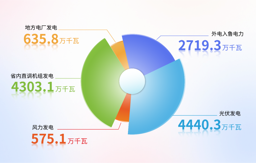 在該時刻,外電入魯電力達2719.3萬千瓦,風光新能源合計5015.4萬千瓦(風電575.1萬千瓦、光伏發(fā)電4440.3萬千瓦),省內(nèi)直調(diào)機組發(fā)電出力合計4303.1萬千瓦,地方電廠發(fā)電出力合計635.8萬千瓦。