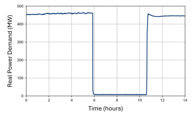這份白皮書還提到,北美一個數(shù)據(jù)中心的用電負(fù)荷在36秒內(nèi)從約450兆瓦下降到約40兆瓦,又在7兆瓦左右保持了大約4小時,隨后幾分鐘內(nèi)回升至450兆瓦(如圖2所示)。
