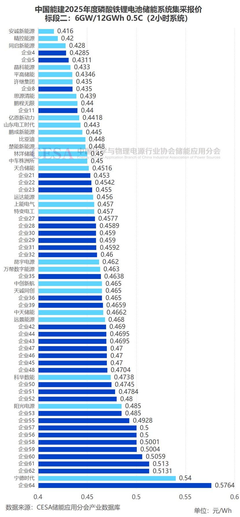 標(biāo)段二(2h儲(chǔ)能系統(tǒng)):采招規(guī)模為6GW/12GWh,64家企業(yè)參與競(jìng)標(biāo),共28家企業(yè)入圍,入圍報(bào)價(jià)在0.416-0.54元/Wh區(qū)間內(nèi),平均報(bào)價(jià)0.4529元/Wh,最低報(bào)價(jià)0.416元/Wh來(lái)自于安誠(chéng)新能源,創(chuàng)2h鋰電儲(chǔ)能系統(tǒng)新低。