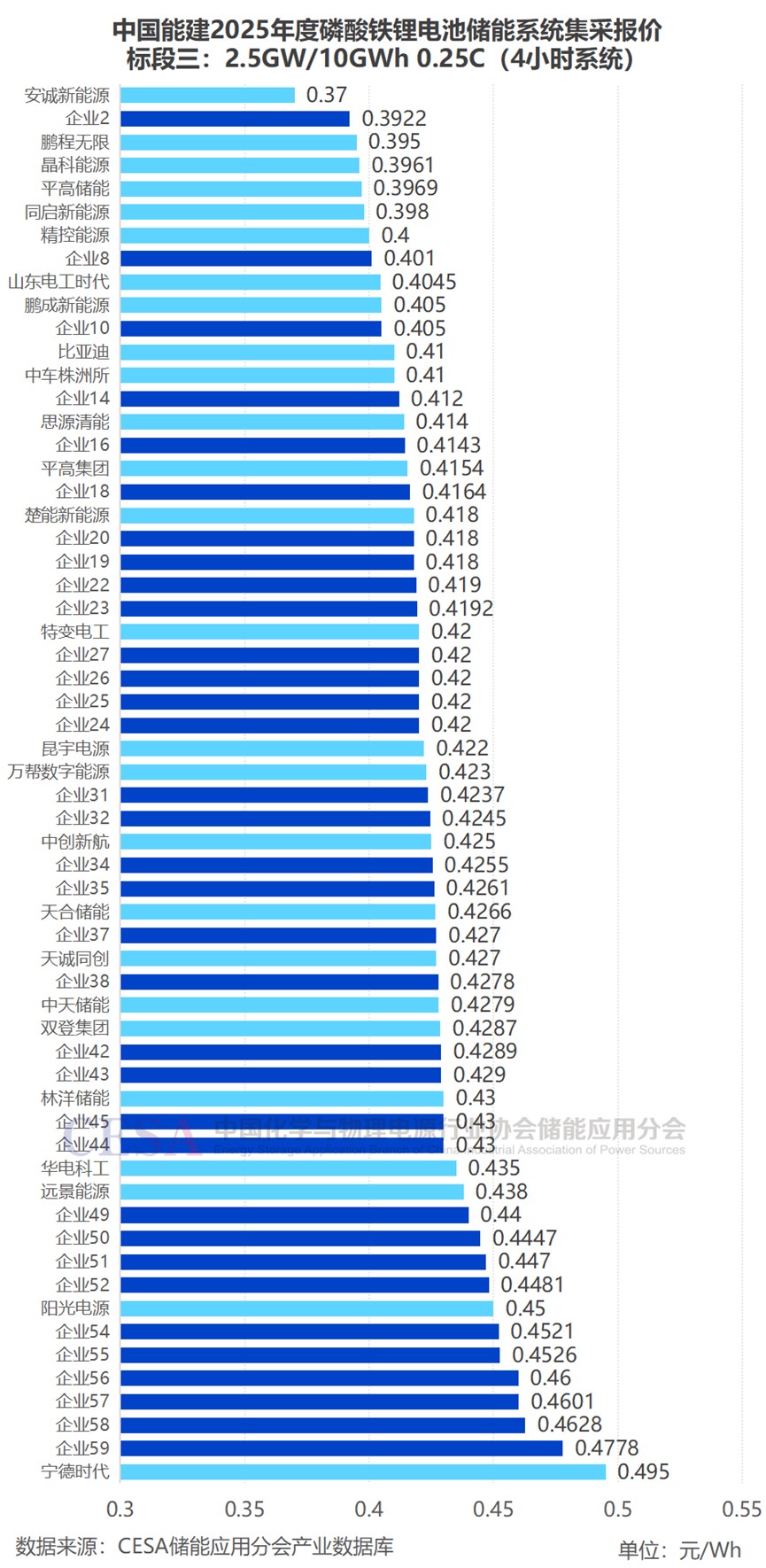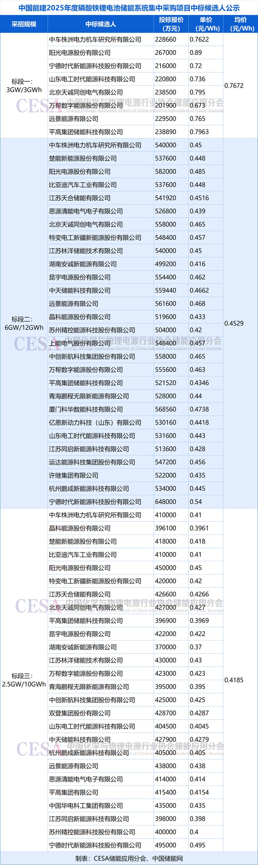 標(biāo)段三(4h儲(chǔ)能系統(tǒng)):采招規(guī)模為2.5GW/10GWh,60家企業(yè)參與競(jìng)標(biāo),共26家企業(yè)入圍,入圍報(bào)價(jià)在0.37-0.495元/Wh區(qū)間內(nèi),平均報(bào)價(jià)0.4185元/Wh,最低報(bào)價(jià)0.37元/Wh來(lái)自于安誠(chéng)新能源,創(chuàng)4h鋰電儲(chǔ)能系統(tǒng)報(bào)價(jià)新低。