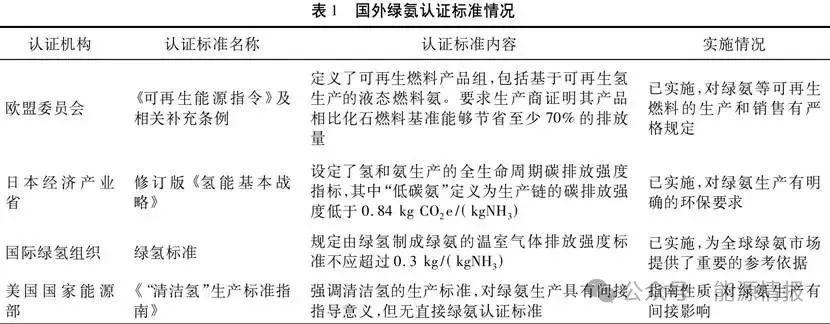國外對綠氨的認證標準已經(jīng)相對成熟,并且不同國家和地區(qū)根據(jù)其自身的環(huán)保政策、技術水平和市場需求,制定了相應的綠氨認證標準。尚未形成統(tǒng)一的國家標準,但有團體標準或行業(yè)標準在探討和實施中,如中國氮肥工業(yè)協(xié)會已正式啟動《綠色合成氨分級標準》的編制工作。對國外綠氨認證標準的歸納和分析見表1。