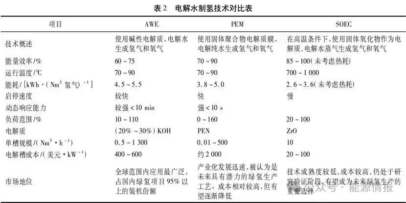 綠氫是指利用可再生能源(如風能、水能、太陽能等)通過電解水技術制得的氫氣,這一過程中不產(chǎn)生二氧化碳,從源頭上實現(xiàn)了二氧化碳的零排放。目前堿性電解水制氫(AWE)、質(zhì)子交換膜電解水制氫(PEMWE)、固體氧化物電解水制氫(SOEC)是三種電解水制氫的主流工藝。技術對比見表2。