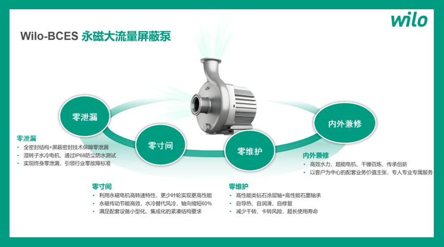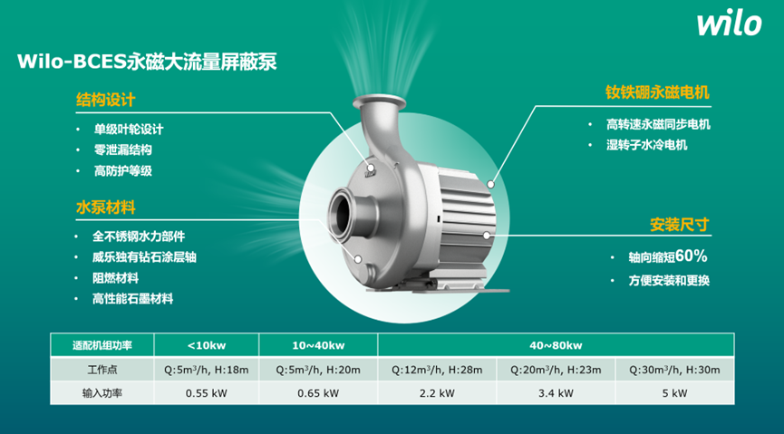 為應對儲能溫控行業(yè)較為嚴苛的應用場景的需求,威樂與戰(zhàn)略合作客戶進行聯(lián)合產(chǎn)品研發(fā),針對高鹽霧、高海拔、高粉塵、高濕度以及狹小安裝空間等常見儲能設備的應用場景,設計推出“零泄漏”產(chǎn)品Wilo-BCES系列永磁大流量屏蔽泵。