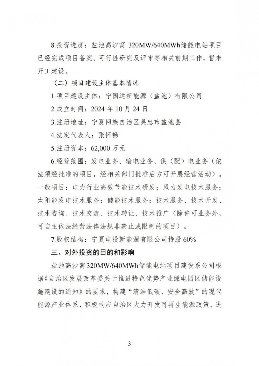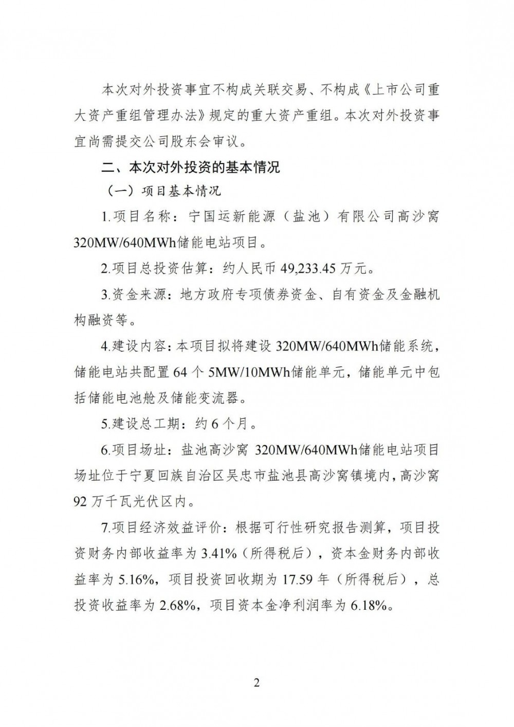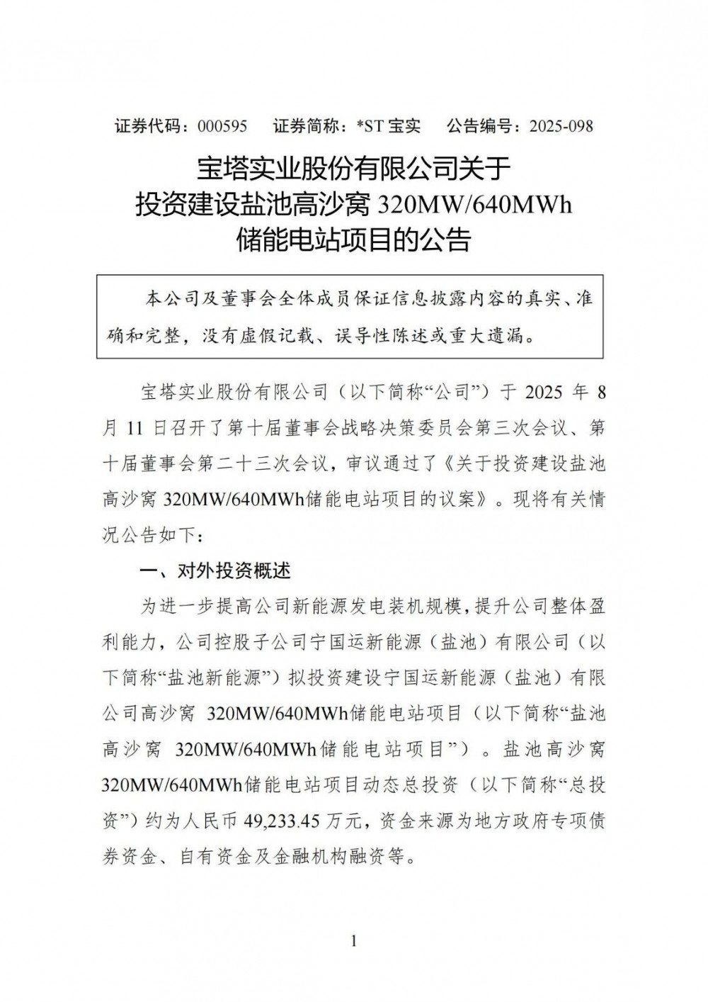 中國(guó)儲(chǔ)能網(wǎng)訊:8月12日,寶塔實(shí)業(yè)發(fā)布公告稱,為進(jìn)一步提高公司新能源發(fā)電裝機(jī)規(guī)模,提升公司整體盈利能力,公司控股子公司寧國(guó)運(yùn)新能源(鹽池)有限公司擬投資建設(shè)寧國(guó)運(yùn)新能源(鹽池)有限公司高沙窩320MW/640MWh儲(chǔ)能電站項(xiàng)目。鹽池高沙窩320MW/640MWh儲(chǔ)能電站項(xiàng)目動(dòng)態(tài)總投資(以下簡(jiǎn)稱“總投資”)約為人民幣49,233.45萬(wàn)元,資金來(lái)源為地方政府專項(xiàng)債券資金、自有資金及金融機(jī)構(gòu)融資等。
