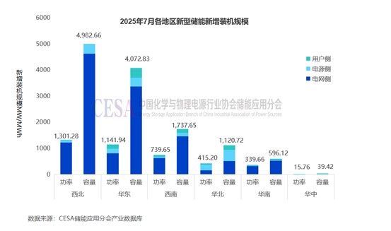 從區(qū)域分布來看,7月西北區(qū)域新增儲(chǔ)能裝機(jī)最大,為1.3GW/4.98GWh,功率規(guī)模占比32.91%,容量規(guī)模占比39.7%,雙雙位列全國(guó)第一,建設(shè)地點(diǎn)主要位于新疆、甘肅,主要以電網(wǎng)側(cè)項(xiàng)目為主。