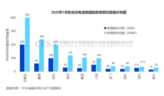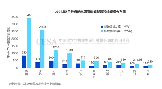 從省份分布來看,7月全國(guó)共有24省份新增投運(yùn)新型儲(chǔ)能項(xiàng)目,其中5省新增裝機(jī)容量規(guī)模超1GWh。