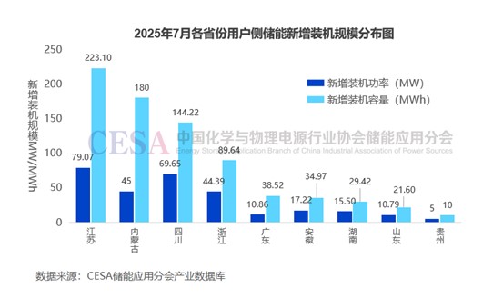 據(jù)不完全統(tǒng)計(jì),2025年7月新增用戶側(cè)儲(chǔ)能項(xiàng)目79個(gè),總規(guī)模為302.98MW/783.53MWh。從規(guī)模上來講,江蘇用戶側(cè)項(xiàng)目并網(wǎng)規(guī)模為79.07MW/223.1MWh,居全國(guó)首位。內(nèi)蒙古、四川并網(wǎng)規(guī)模均超百兆瓦時(shí)。