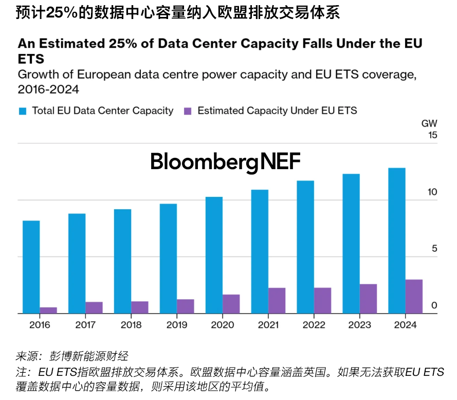 彭博新能源財(cái)經(jīng)預(yù)測(cè),到2030年,歐洲數(shù)據(jù)中心的電力消耗將增加一倍以上,達(dá)到155TWh。到2030年,為這些負(fù)載供電的電力生產(chǎn)商和數(shù)據(jù)中心每年可能面臨高達(dá)50億歐元的ETS許可費(fèi)用,幾乎是預(yù)計(jì)的2025年11億歐元的五倍。