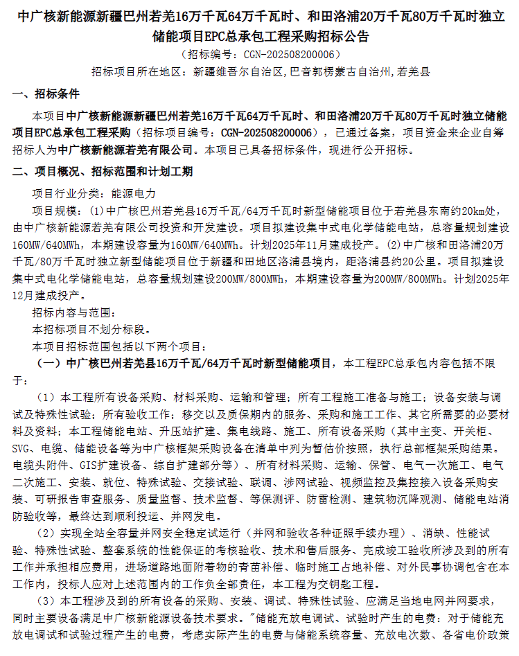 中國儲能網(wǎng)訊:8月25日,中廣核發(fā)布新疆巴州若羌160MW/640MWh、和田洛浦200MW/800MWh獨立儲能項目EPC總承包工程采購。