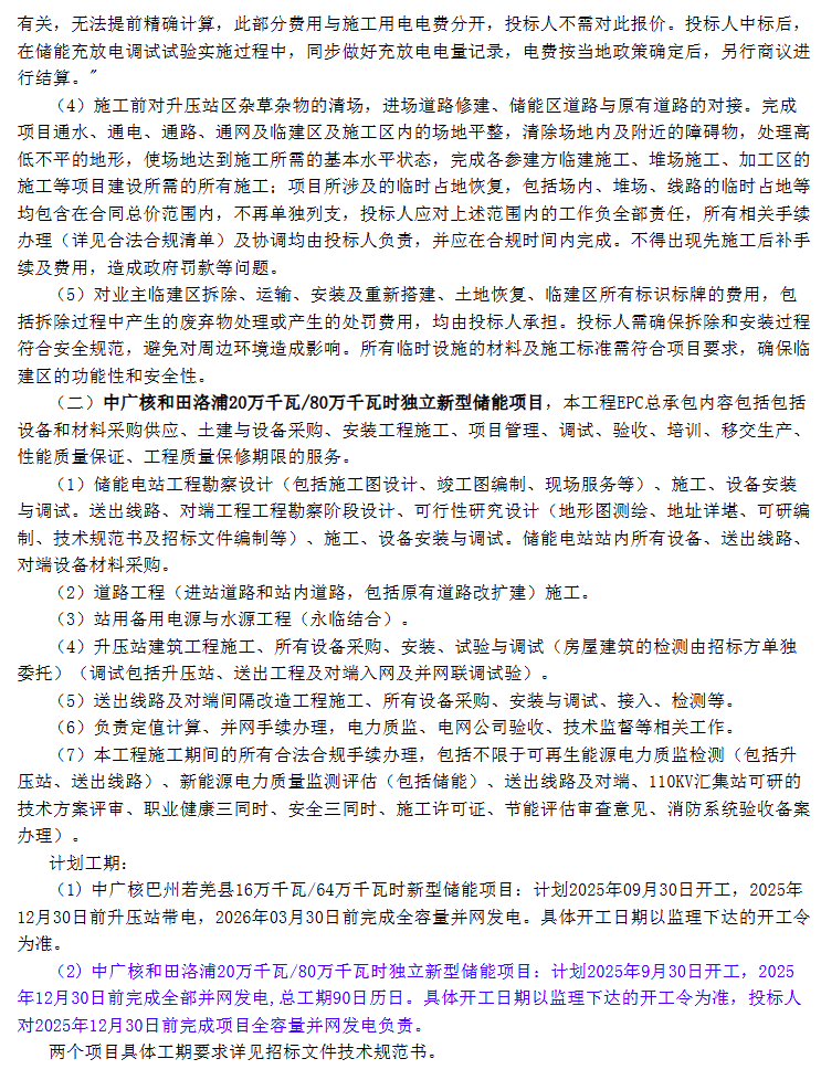 中廣核和田洛浦200MW/800MWh獨立新型儲能項目位于新疆和田地區(qū)洛浦縣境內(nèi),距洛浦縣約20公里,擬建設(shè)集中式電化學(xué)儲能電站。計劃2025年9月30日開工,2025年12月30日前完成全部并網(wǎng)發(fā)電,總工期90日歷日。投標(biāo)人對2025年12月30日前完成項目全容量并網(wǎng)發(fā)電負(fù)責(zé)。