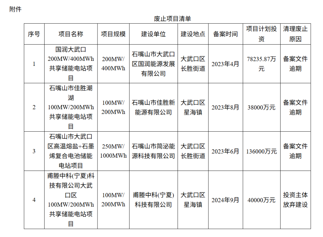 中國(guó)儲(chǔ)能網(wǎng)訊:8月22日,寧夏石嘴山市大武口區(qū)發(fā)展和改革局發(fā)布關(guān)于廢止一批新型儲(chǔ)能項(xiàng)目的公告。共四個(gè)儲(chǔ)能項(xiàng)目,合計(jì)650MW/1800MWh,其中有三個(gè)廢止原因?yàn)閭浒肝募馄冢?個(gè)因?yàn)橥顿Y主體放棄。