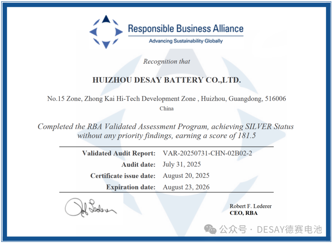 中國儲能網(wǎng)訊:在全球供應(yīng)鏈體系日益重視可持續(xù)發(fā)展與社會責(zé)任的今天,德賽電池積極融入國際標(biāo)準(zhǔn)體系,于2025年7月順利完成RBA(責(zé)任商業(yè)聯(lián)盟)VAP審核,并成功獲得白銀等級認(rèn)證。這一成果不僅標(biāo)志著公司在企業(yè)社會責(zé)任領(lǐng)域的堅(jiān)實(shí)進(jìn)步,也為構(gòu)建面向未來的競爭力奠定了堅(jiān)實(shí)基礎(chǔ)。