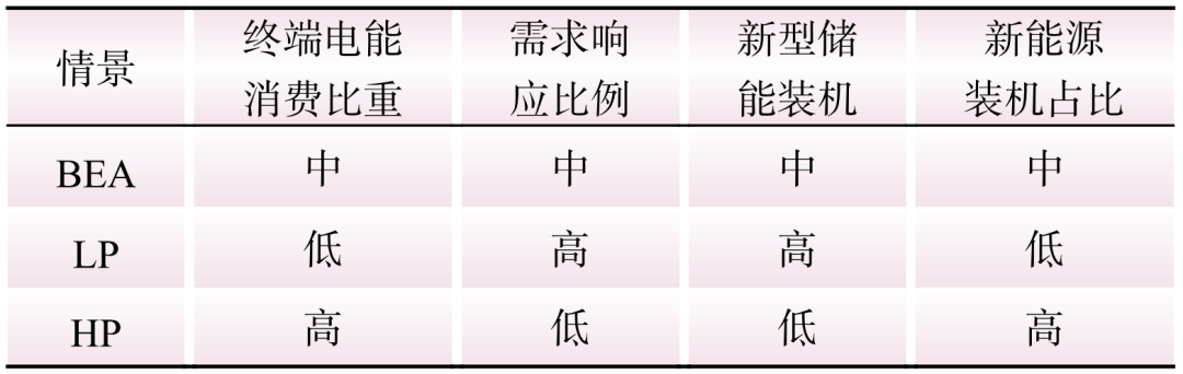 為探索多因素復(fù)合影響下的電網(wǎng)基建投資結(jié)構(gòu)發(fā)展變化,對(duì)終端電能消費(fèi)比重、需求響應(yīng)比例、新型儲(chǔ)能裝機(jī)、新能源裝機(jī)占比4個(gè)關(guān)鍵因素的發(fā)展情況進(jìn)行合理組合,得到未來可能的3種發(fā)展情景,分別是基準(zhǔn)情景(BEA)、系統(tǒng)調(diào)節(jié)資源緊缺情景(HP)和調(diào)節(jié)資源充足情景(LP),對(duì)電網(wǎng)基建投資結(jié)構(gòu)變化趨勢(shì)進(jìn)行模擬,如表1所示。