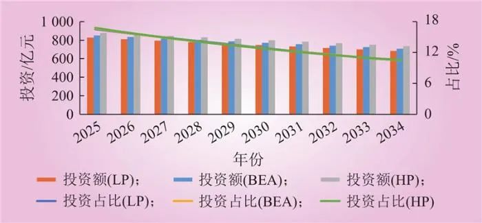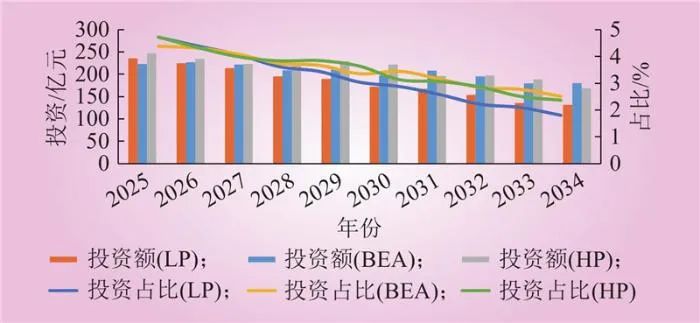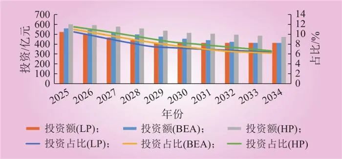 圖3所示3個(gè)情景下的電源接入投資額及其占比都呈現(xiàn)波動(dòng)下降的趨勢(shì),BEA和LP情景的波動(dòng)性更強(qiáng),這一波動(dòng)性也導(dǎo)致了不同情景下接入投資占比趨勢(shì)線存在交叉,2025—2027年,LP情景下的電源接入投資占比最高;2027—2030年,HP情景下的電源接入投資占比最高,BEA情景次之;2030—2035年則是BEA的電源接入投資占比最高。
