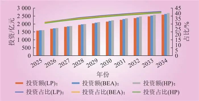 圖6所示3種情景下電網(wǎng)負(fù)荷增長(zhǎng)投資及其占比都呈現(xiàn)出上升的趨勢(shì),但投資和占比的高低并非同步變化,從投資額來看,最大的是HP情景,其次是BEA情景,最后是LP情景;從占比角度來看,2032年以前,LP情景高于BEA,BEA高于HP,2032年以后則完全相反。
