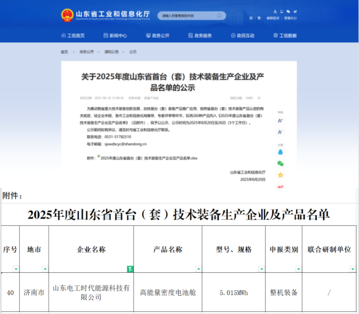 中國儲能網(wǎng)訊:近日,山東省工業(yè)和信息化廳發(fā)布2025年度山東省首臺(套)技術(shù)裝備生產(chǎn)企業(yè)及產(chǎn)品名單,中電裝儲能所屬山東電工時代5.015MWh高能量密度電池艙成功入選首臺(套)整機(jī)裝備名單。該成果標(biāo)志著中電裝儲能在儲能技術(shù)創(chuàng)新、高端制造、產(chǎn)業(yè)化應(yīng)用等方面取得重大突破,將進(jìn)一步推動公司儲能業(yè)務(wù)的創(chuàng)新發(fā)展,為儲能產(chǎn)業(yè)高質(zhì)量發(fā)展注入新的動力。