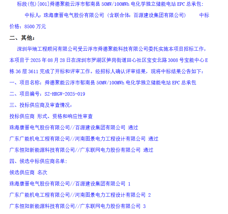 中國(guó)儲(chǔ)能網(wǎng)訊:8月28日,舜德聚能云浮市郁南縣50MW/100MWh電化學(xué)獨(dú)立儲(chǔ)能電站EPC總承包中標(biāo)信息公示。珠海康晉電氣股份有限公司、百源建設(shè)集團(tuán)有限公司聯(lián)合體以8500萬(wàn)元中標(biāo)該項(xiàng)目,折合單價(jià)0.85元/Wh。廣東廣能機(jī)電工程有限公司和河南圖景電力工程設(shè)計(jì)有限公司聯(lián)合體、東恒陽(yáng)新能源科技有限公司和廣東聯(lián)網(wǎng)電力股份有限公司聯(lián)合體分列第二第三位。