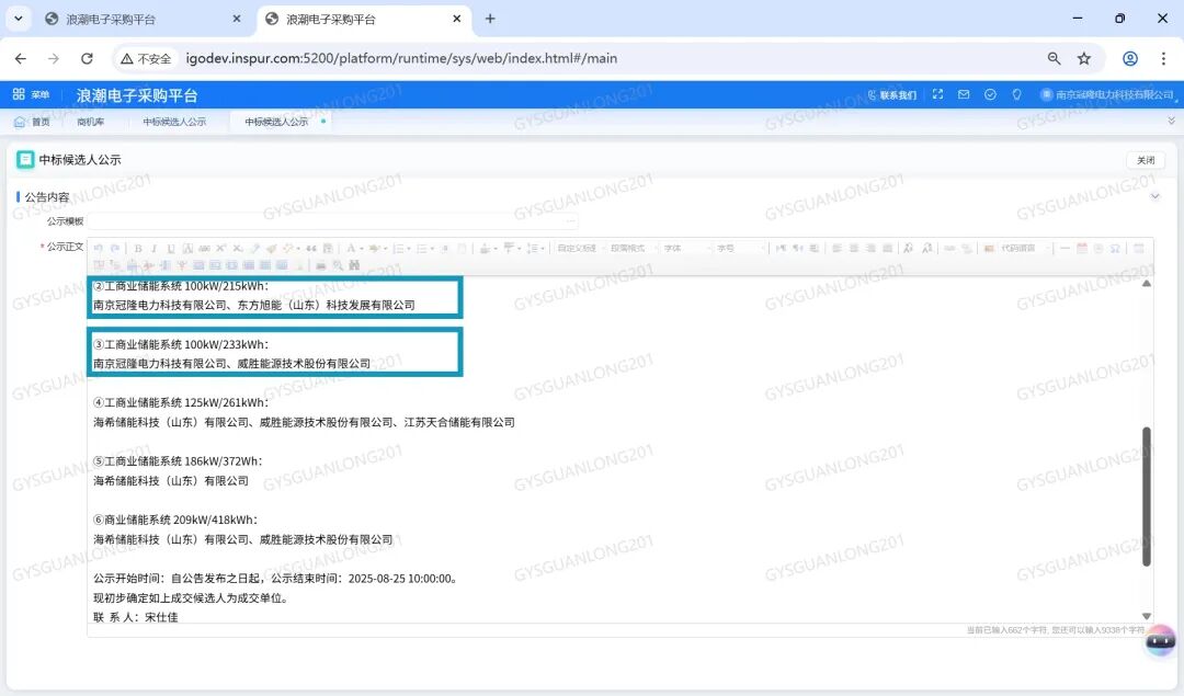 中國(guó)儲(chǔ)能網(wǎng)訊:近日,浪潮集團(tuán)正式公布了總規(guī)模400MWH—2GWH儲(chǔ)能系統(tǒng)集成代工商的招標(biāo)結(jié)果,南京冠隆電力科技有限公司憑借深厚技術(shù)積淀與行業(yè)口碑,強(qiáng)勢(shì)中標(biāo)100kW/215kWh、100kW/233kWh工商業(yè)儲(chǔ)能系統(tǒng)標(biāo)段。