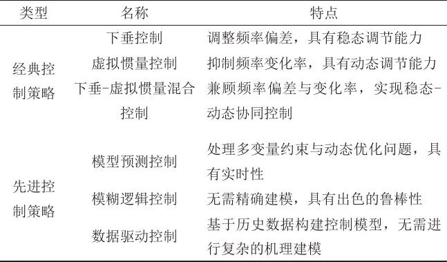 設計恰當?shù)目刂撇呗詫τ诒U铣夒娙菰谡{(diào)頻過程中精準出力至關重要,現(xiàn)有的控制策略大致可以分為兩類:經(jīng)典控制策略和先進控制策略。經(jīng)典控制策略主要包括下垂控制、虛擬慣量控制,以及基于二者的混合控制。先進控制策略主要包括模型預測控制(model predictive control, MPC)、模糊邏輯控制(fuzzy logic control, FLC)和數(shù)據(jù)驅(qū)動控制等。超級電容的調(diào)頻控制策略匯總?cè)绫?所示。